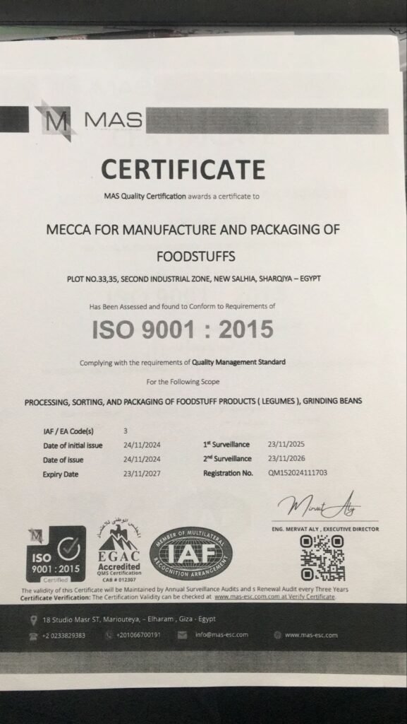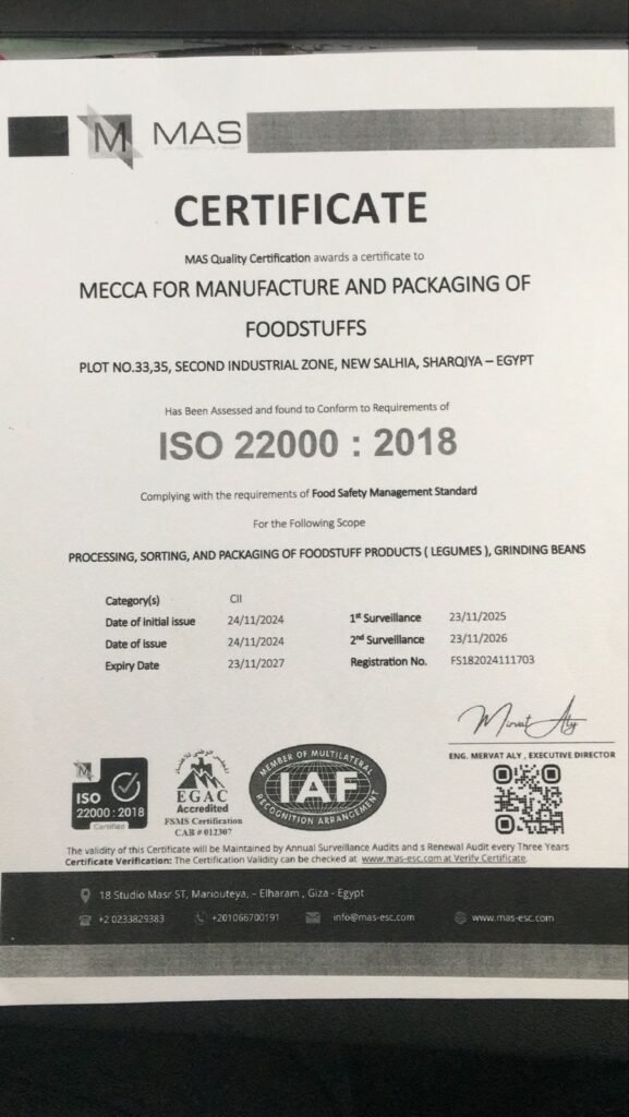 نلتزم في شركة المزرعة للبقوليات بتطبيق أعلى معايير الجودة والسلامة الغذائية في جميع مراحل العمل، وقد حصلنا على شهادات اعتماد رسمية تؤكد التزامنا بالمواصفات القياسية المحلية والدولية، مما يعزز ثقة عملائنا داخل مصر وخارجها.